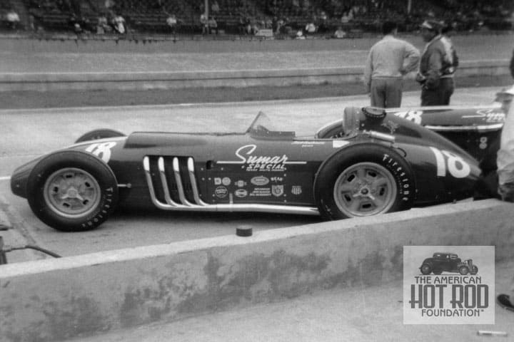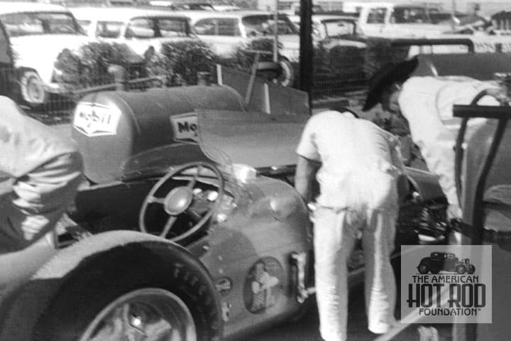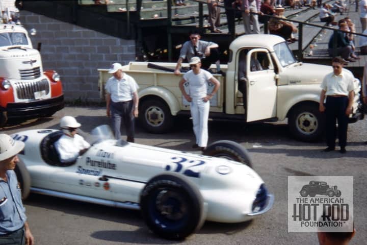 Texan’s Ken Rich and Paul Lacey sponsored this Watson built creation at Indy in 1960 that was known as the Ken-Paul Special (BHC_033). In what has to be one of the most thrilling 500’s ever, a former California track roadster driver named Jim Rathmann finally took home the marbles after three-second place finishes in previous years. The car is seen in Gasoline Alley before the race being attended to by Chickie Hiroshima, back to camera, and an ever-watchful cowboy-hatted Smokey Unick.