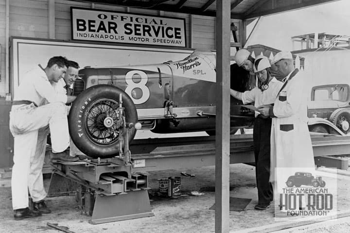 We see Ralph Hepburn’s 1937 Indy ride getting its chassis set up at the Bear center within Gasoline Alley (CKC_756). Myron Stevens built the car that Ralph would drive to a second-place finish after starting down in sixth. The car was entered as the Hamilton-Harris Special and was powered by a 255″ Offy. Louis Meyer was the owner, and in ‘36 he had won the 500-mile race in the same car.