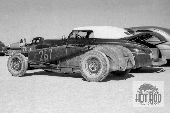 Just about dusk two “Sleds” showed. One was a seldom-seen ‘55 Poncho Chiefton 2-door hardtop like the one I use to own back in ‘63 (that’s called deja-vu). The other was a 1958 Chevrolet that had undergone quite a bit of body surgery. The car started life as a four-door of most likely Del Rey variety before the top was done away with as well as the rear doors being molded in. We had to snap the tail fur next act we chose this 35mm negative and scanned it about 24 times larger than its original size (DCC_306). We do the large deal on unusual and famous cars that we think would be perfect for use in a coffee table book down the road. Upfront is an interesting car listed as a ’26 T but sporting a Deuce tail section that was photographed at the June 11-12, 1949 S.C.T.A. El Mirage meet. The entrant was Bob Barlow of the San Diego Roadster Club. His Class C “Lakester” had a 267″ ’46 Merc under the hood fitted with Edelbrock go-fast parts. We have him running 127.84 mph at the May meet for an 11th in class and 130.81 mph at the June meet. In the upper left is D. W. Middleton’s Class B Lakester consisting of a ’27 Ford body and a ’41 Ford-6 powerplant displacing 226″. We have him entering in the June and October meets but don’t have any speeds on the Night Owls member.