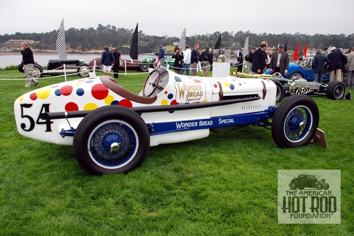 The Wonder Bread Special was entered in the 1933 500 mile classic by F. E. Clemons but didn’t qualify. It was driven by George Barringer. To the right is Jimmy Clark’s ’65 race-winning Lotus powered by Ford. In the background from the left is Leon Duray’s number 4 Miller that sat on the pole in ’28, Wilbur Shaw’s ’40 race-winning Maserati number 1 and Jimmy Jackson’s Cummins-Kurtis from ’50 that also set speed records at Bonneville with its Diesel engine.