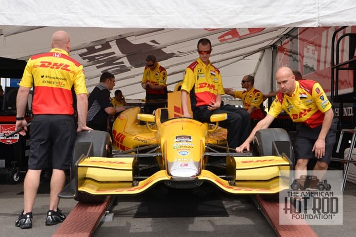 Ryan Hunter-Reay’s Andretti Motorsport Honda-powered Dallara is seen exiting the tech inspection area at Long Beach on a Thursday morning April 10, 2014 (JMC_4678). Ryan qualified the car on pole position and was in contention for the win until lap 55 when four cars tangled and he was eliminated from the race. He was classified as finishing in 20th place.