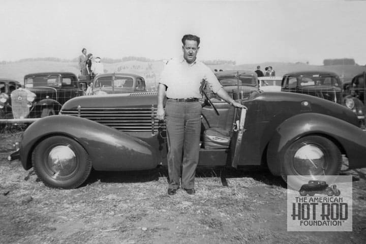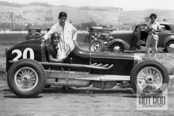 To show the car off a little better we found this shot of racer Babe Stapp with the car at the Oakland Speedway in 1940 standing next to it in the infield (CKC_1452). Do you think he’s offering us a chance to drive it? Probably not. The great thing about this one iis that it still exists and was spied at the GNRS in Pomona a couple of years ago. And yes it would look good at the malt shop with a tray hanging on the door.