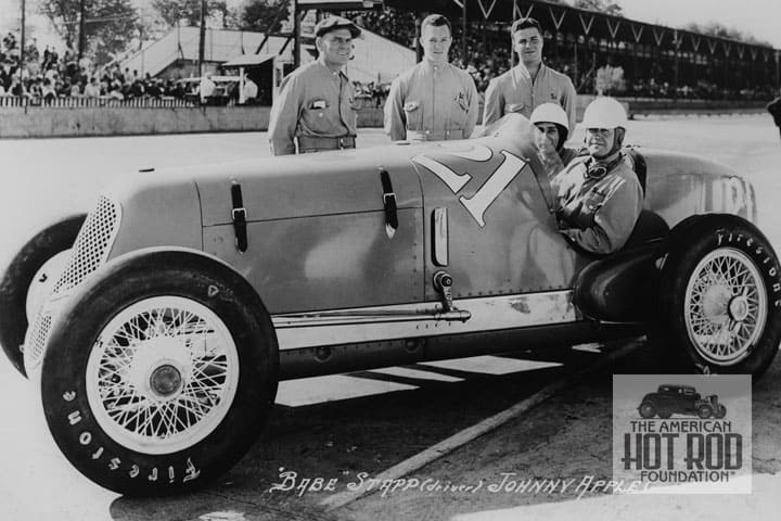 We’re being a little sneaky this week using the above two shots to set-up up for what happened today (Sunday) in a town called Speedway, Indiana. Since Babe Stapp was shot with the Lee car above we thought it would be cool to show him behind the wheel of his work vehicle back in 1936 (CKC_720). Babe and his riding mechanic Johnny Apple pose proudly in the seat of Gil Pirrung racer after qualifying for the ‘36 500. The Wilbur Shaw conceived light blue car had a 255″ Offy for power and got the boys into the race with a speed of 118.942 mph to started in the middle of the front row. Bad luck struck after completing 89 laps when the crank broke. This wasn’t as bad as their team car which had a little altercation with the wall in practice. Driver Tony Gulotta walked away but the car was trashed. As a side note what was left of Gulotta’s wreck was the basiis for Joel Thorne’s Art Sparks built Land Speed Car that would eventually be sold to bus manufacturer Lou Fageol and would appear again at Indy as a Sports Car.