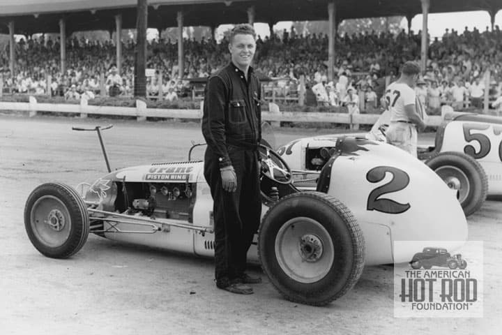 CKC_879 shows Troy Ruttman at Williams Grove, PA in 1954 standing next to J. C. Agajanian’s ’52 Indy winner in his low tech driving suit. Nice shoes too.