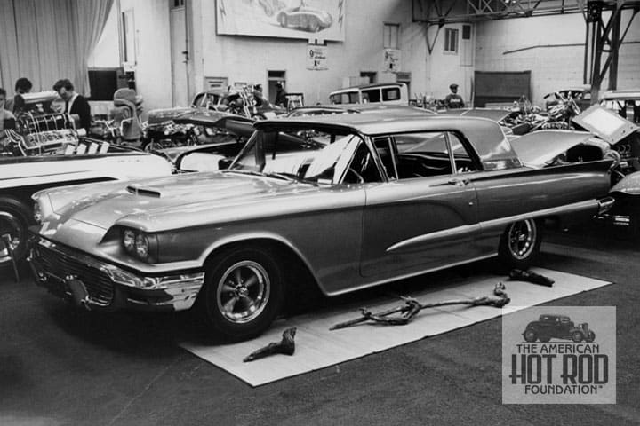 We were scanning some more shots taken at the Grand National Roadster Show back in ‘66 and wondered if they still existed. Let’s look at a couple. First up is Sacramentoite Ronald Haworth’s mild custom (GHC_091). The ’59 Thunderbird had all its body seams molded and featured french rear taillights with handmade lenses. It featured a black diamond tuff interior with walnut paneling. Anybody have a clue if it’s still around?
