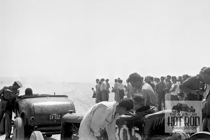 At the Sidewinders Club Meeting Tuesday night S.C.T.A. Racing News photographer Stuart Harnick passed on to us a to-die-for postcard Postcard from Scott Bloom of Woodland Hills Camera (we’ve got the coolest friends everywhere) (SHC_005). We see the White Triplex zooming down tta clue as to the Deuce but number 305 was listed as Fenton Morrill. His speed was 114.64 mph. Note the Morrill body started life as a ‘27 Phaeton before the back half was discarded and how big the gas tank was that indicates it was probably street driven. We also like where the ‘39 Teardrop lites were hung.