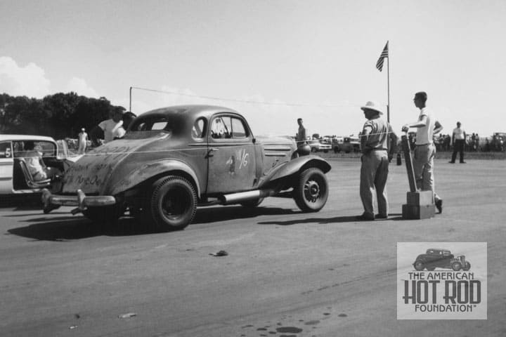 Here’s a cool shot Doug took before he met up with Uncle Sam (DRC_036). Take one 1936 Chevy coupe and let’s go racin. We like the way the fenders have been cut and the missing rear decklid has been replaced with a home-built one. Best of all is the slogan painted on it, “Sleepy Honk Hotn I’ll Move Over”. Photographed at Omaha Dragway in July 1961. We call this a real American Hot Rod.