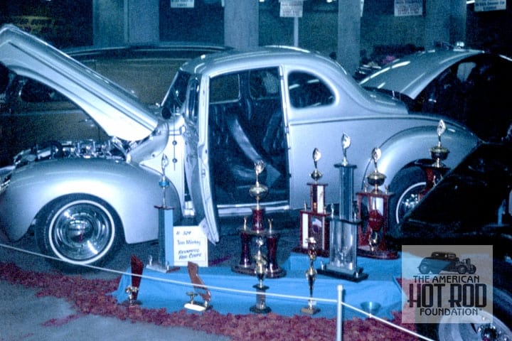 Next up is Tom Mierkey’s ’40 Ford also seen at the ‘68 GNRS (DRC_095). The car was entered in the Revamped Rod Coupe class and featured a 322″ Buick Nailhead for power. The interior is Black Diamond tuft and the windows are t tinted. The dash is silver flake and the exterior is Silver Sungleam acrylic lacquer with subtle pinstriping. Looks like he’s received some loot already in the form of multiple trophies.