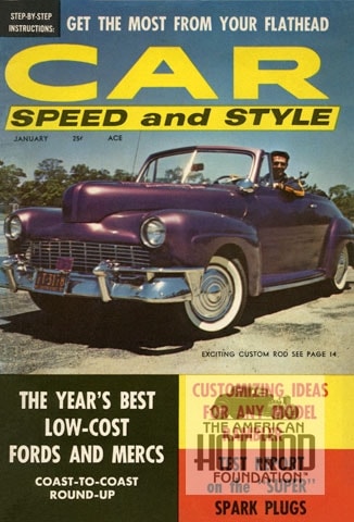 We present Volume 1, Number 2 issue of Car Speed and Style from January 1958 (JMC_5027). On the cover is Tony Marchesi’s 1946 Ford Ragtop. Tony was a member of the Valley Stream, New York Pacers Car Club. Under the Metalic Orchid lacquered hood with 82 louvers lurks a flat motor fitted with Edelbrock heads and intake, 3/4 race cam, Harmon & Collins ignition and dual 97’s. The frontront’s to. The mods look better than the original.