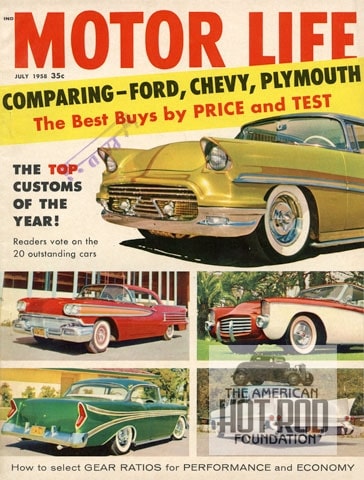 As a kid, one use to look through every magazine at the local drugstore and only buy the ones he could afford. Years later it is ok now I can almost afford the oldies so here’s one we picked up last weekend. It’s Volume 7, Number 12 of Motor Life Magazine published by Quinn Publishing (JMC_5033). We got this issue because it was chocked full of custom car ideas not to mention the color shots on the cover. That’s Ray Cress’ ‘56 Merc on the top, Gene Winfield’s 58 Olds and Jim Butler’s ‘55 Stude in the middle and Helen Avila’s ‘56 Chevy and Bob Metz’s ‘55 Buick on the bottom.