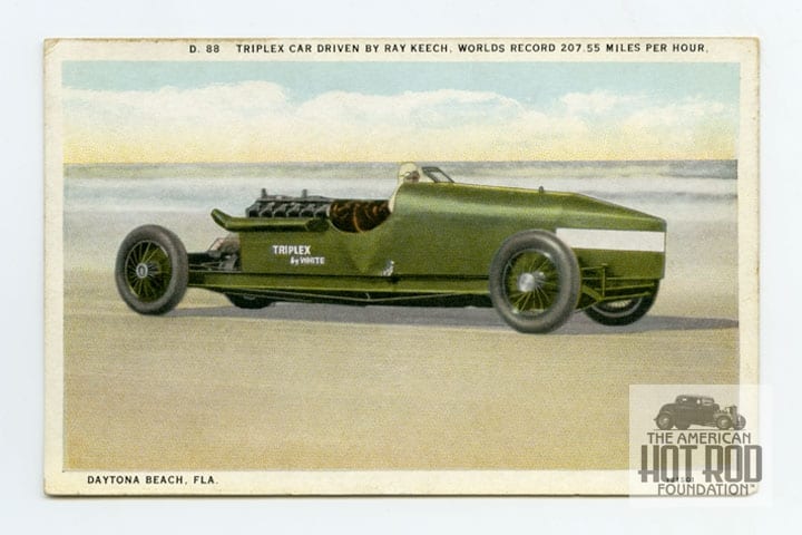 The sands of Oramond-Daytona beach on April 22, 1928, in this postcard on the way to establishing the World Land Speed Record at 207.552 mph. The beast was powered by three V-12 Liberty Aircraft engines displacing a total of almost 81 Litres (about 5,022 cubic inches), one in front, two in the rear that all fed the rear axle. On March 12, 1929, Lee Bible would die in the car while trying to beat the new Segrave record of 231.446 mph.