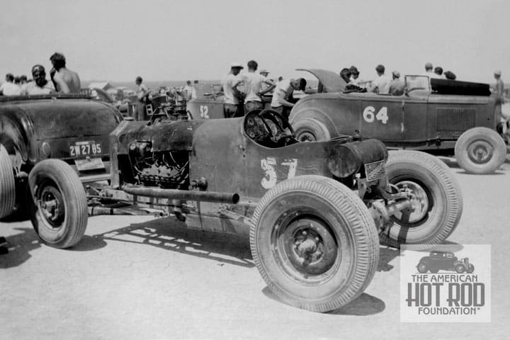 We’ve got this shot pegged as being taken at the June 2, 1946, S.C.T.A. races at El Mirage (BPC_073). Number 57 is Gophers’ member Don Blair’s Merc powered Unlimited that was supercharged and would soon make a lap at a speed of 141.06 mph. Don then went out and set a two-way average for a new record of 134.08 mph. Without anything but a Gophers plate on the Deuce in front of Don’s car we were stuck on an ID until we spotted Lou Baney in his goggles standing next to it. That meant he was running as number 59 at this meet and turned a speed of 119.84 mph. In the rear to the right is the number 64 machine that was listed as a Club Post Entry but no name went with it. The car ran 113.78 mph. Behind it is the number 52 Deuce Roadster of brother Bruce Blair who ran 113.20 mph that day. Behind Bruce’s car, we see another roadster that sports a 1 and an 8 with a hidden number in between, is it Edward Haade, Phil Roberts, William Roberts, Archie Tipton, Doug Deverich, Ted Peckles, C. O. Prather or George Ausburn? When we find another shot of our mystery Roadster that has a readable number we’ll let you know who the real player was. This shot was a little 3 3/8” x 4” black and white print trimmed down to the edges so we took the liberty to add more sky and foreground to fit our 35mm format used on the site.