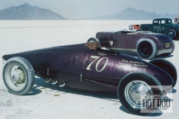 Our next cool ride is Kenny Lindley’s Modified powered by a Ford flattie at the April or June ’46 S.C.T.A. lakes meet at El Mirage (BPC_068. The guy in the striped T-shirt was working behind the timing stand and was notating speeds on timing slips taped on the car as they returned from a run. Were on the lookout for his ID. In April Kenny ran third in class with a speed of 126.76 mph. In June he ran 128.02 mph for what we’re calling first in class against Karl Orr’s pre-war class record of 133.03 mph. This car would later be run by Dietrick-Thomas and get a new nose and tail. It would also end up as S.C.T.A. Season Co-Champion and still exists in that form. The bottom of the front wheel was trimmed off so we fixed that and also added some sky like the above shot.
