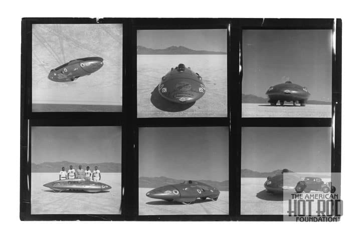 Here ia s sampling from a contact sheet of images taken for a story on the Bill Burke-Bob Lasiter built Streamliner that appeared in the January 1961 issue of Sports Car Illustrated magazine and was sponsored by the same. The shot in the upper right appeared as a 2-page blowup in that issue. Bill Stroppe and Company put together a 156″ Falcon six for Bill and Bob to power the little 85″ wheelbase car. At the bottom left we have unknown, Bill Stroppe, Bill Burke, Bob Laster, and Verne Houle. After tipping the Nitro can the car two wayed at a speed of 205.949 mph for a new Class D Liner record that got Bill into the 200 MPH Club. In typical Burke humor the car was called “Golden Commode” instead of Shit Box. Each image is 2 1/4” X 2/14” and made by laying the neg on the print paper and exposing light to it. If you look closely you can see processing marks on the negs and tons of spots that equaled hand processing and a dirty printing environment. We’ve scanned every image and they are now each18” wide.