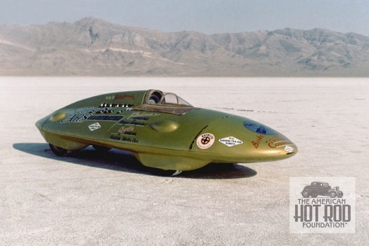 We couldn’t resist pulling out a Freddy Larsen color shot of the Commode (FLC_262). The press and on-lookers nick-named it the Pumpkin Seed as a ‘60’s version of political correctness. It was Burke’s interpretation of the MG EX-181. The car was entered in two classes, Class D as number 1888 and powered by a Bill Stroppe prepared 156′ Falcon inline 6 and class G as car number 888 with a 61″ Austin-Healey Sprite 4-banger for power. With Bill driving the class D streamliner ran 202.360 mph for a first in class and then he bumped the class record to 205.949 mph. In class G it managed to run 124.82 mph for a second in class against the Wee Eel ride at 158.80. The Wee car then set the class record at 135.182 mph. Burke later teamed up with Mickey Thompson and ran a Tempest in it. The car still exists today in lengthened form and is owned by Jim Travis. In recent years Jim, his son Randy and Danny Thompson, Mickey’s son, have all driven the car.