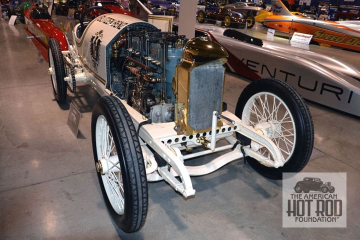 Seriously, this Speedweek marks 100 years since race cars made their first appearance on the salt. It doesn’t matter that it was a dog and pony show to make some bucks for a promoter, we got real race cars speeding across our holy grail. One of the cars was called Blitzen Benz. We had one of these wonderful beasts at the Land Speed Exhibit at this January’s Grand National Roadster show that seen in our next shot (JMC_5054). Under the hood is a 21.5 Litre 4-banger. Oh yeah, we retouched out the rope that was between the lens and the front tires to give you an unobstructed view.