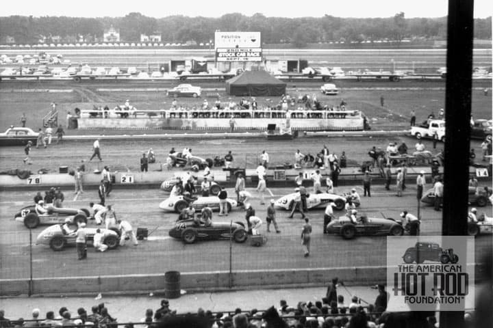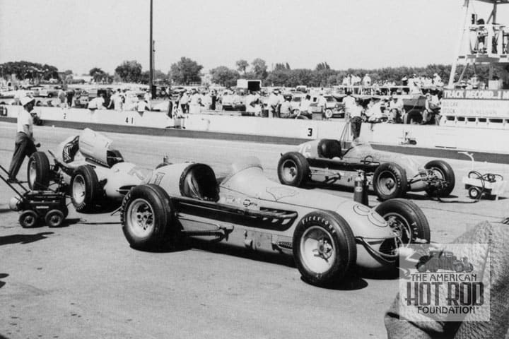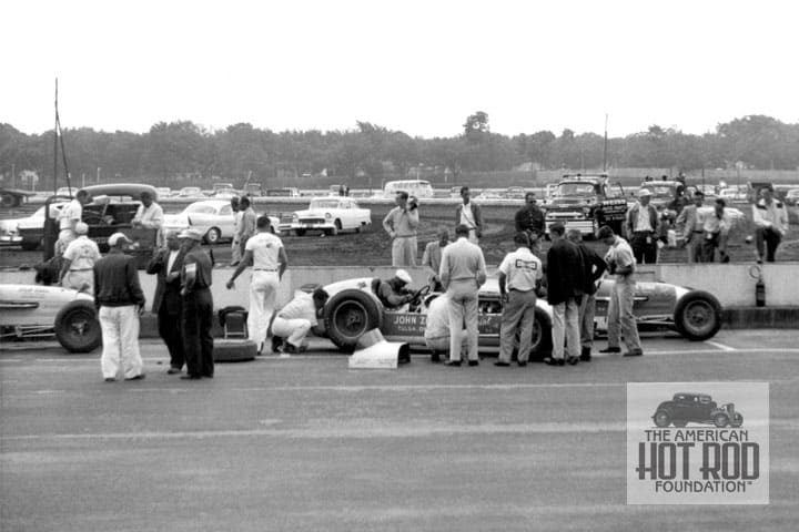 In the center of our next shot is the number 8 John Zink Watson built Offy driven by Dick Rathman (he starter racing in Track Roadsters after the war in California). It’s getting the once over in pit lane during practice for the Milwaukee 250 held on August 26, 1956. On the right is the John Zink Watson dirt car driven by Ed Elisian. On the left is the nose of the Jud Phillips built Bob Estes dirt car driven by Don Freeland (another track roadster driver). Rathman qualified down in 15th and lost oil pressure in the race and was classified as 25th. Elisian started in 26th, crashed out in turn two and was classified as 22nd. Freeland started in 7th then lost his mag the finish down in 24th.