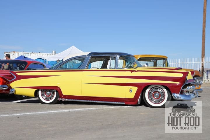 A little pre-planning said to bring the camera as you never know what you’ll find at Gene’s place And it was a brilliant idea if we don’t say so as just inside his front gate we spied our first victim to shoot (JMC_5166). We’re looking at a nice looking 1954 Chevrolet that most likely started life as a Model 150. After a nose and deck, a shave and a top chop and a wild flame/scallop combo this one looked Bitchen. The Caddie caps added some extra class to it in our book.