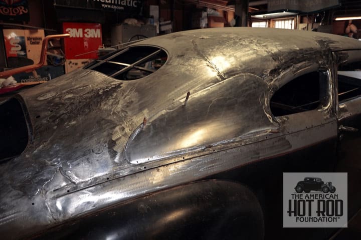 Snooping through all the buildings on the property is half the fun and we found this in the works ‘41 Lincoln Zepher having its lid lowered the old fashioned way, lots of tin massaging and lead (JMC_5171). Gene said it takes a lot more time, effort and moola to do it this way but it will last a lot longer than a bondo job. You also get a good workout with the vixens.