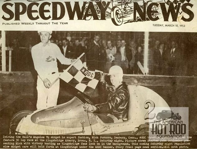 We got another e-mail during the week from Jerry Junkins from Pennsylvania (sorry he’s not related to Johnny, we asked). He had seen our post of a Roy Richter (Bell Auto Parts) built 3/4 (TQ) Midget from back in the early ’50s and said he migJJC_001) ht own the car and sent us a shot of it that appeared on the cover of Illustrated Speedway News back in March 1953 (JJC_001).