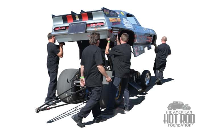 The shape of funnies hasn’t changed that much except for bigger crews, spending more money, being slipperier and going lots faster. We see the Mike Burkhart Camaro stripped of its body between rounds at Bakersfield on Saturday (JMC_5224).