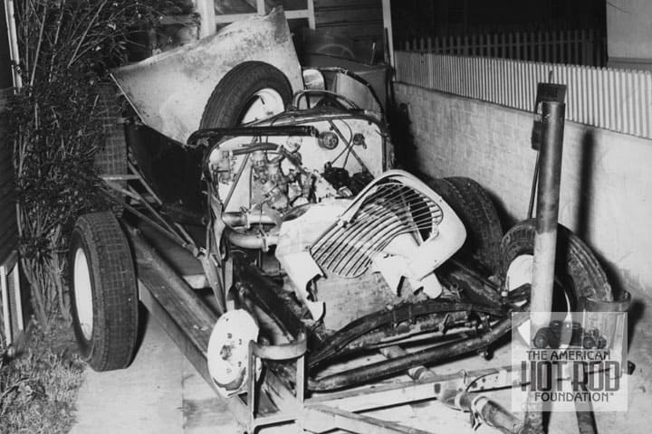 Like the above shot of Swanson trashing his car, Track Roadsters more often than not suffered the same fate. Red had painted the car up real pretty for the 1950 Russetta Hot Rod show and not too long after that kablammy! GRW_020 shows what’s left of the roadster. Note the center of the front rim didn’t like its rivet job.