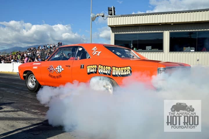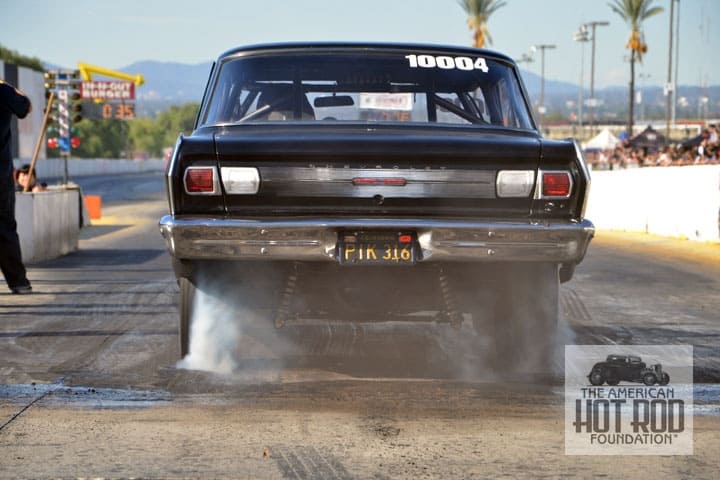 There were lots of cool customs about, and this slammed 1951 Chevrolet Fleetline with a lowered lid was one of them (JMC_5355). It featured a ’53 Chev grill-bar with extra teeth and the ’57 bumper fittthave to learn the hard way (JMC_5369). We snapped this ‘65 Chevy II Nova about 10 feet behind it during its first burnout and got pelted with mass quantities of foreign objects. It’s been a drag car for only two seasons and the driver and crew are having a blast just like we did.