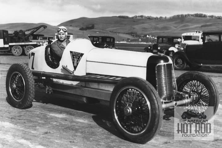 After the Ford talk, our conversation turned to inspiration for his great grills. Yep, old race cars are the source. We printed out a few dozen inspirations and sent them off in the post. Here is one to that’s a little different (CKC_1669). Lou Moore of Blue Crown Spark Plug Special fame (his cars won the 500 in ’38, ‘41, ‘47, ‘48 and ‘49) is seen at Oakland Speedway (not far from Steve’s present shop) in 1931 in his one-off single seater with a short wheelbase, the Boyle Valve Special Miller. The cream, black and red car was owned by Chicagoan Mike Boyle (his cars ’won the 500 in 34, ‘39 and ‘40). Power was provided by a newly designed inline 8 that started life at 230″ and ended up with 248″. Note the unique lower grill shell shaped to miss the front axle. Number 7 was Lou’s Pacific Coast car number.