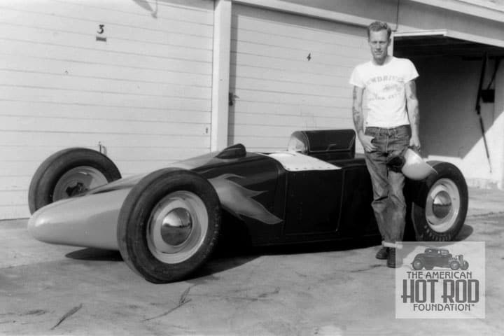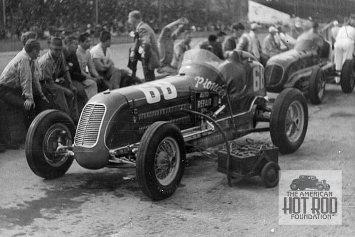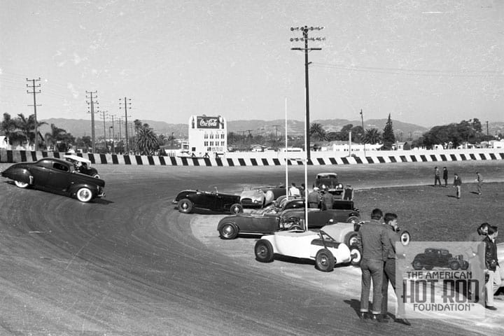 Here’s an interesting shot taken at Carroll Speedway (DCC_371). Pete Petersen and his boys gathered together some of So-Cal’s best rods for a look see and which one’s do they want to be on display at the Second Annual Hot Rod Expo they were putting on at the Los Angeles National Guard Armory on January 21-30, 1949. On the far left is Earl Bruce’s famous ‘40 that he had chopped fight off the showroom floor. The car almost dead center in the shot without paint is Norman Timbs’ rear-engined Buick powered sports-liner. After languishing for years it’s been restored by our pal Dave Crouse at Custom Auto in Colorado.