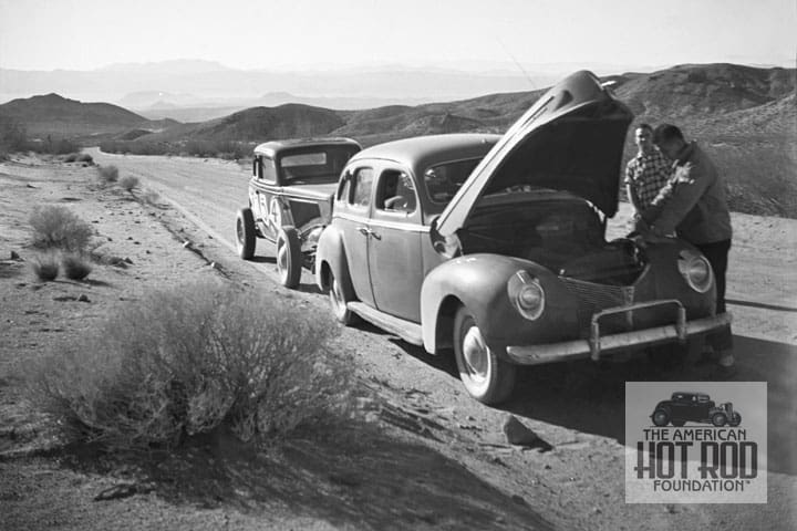 So you like the good old days, do you? Trekking to the dry lakes during the racing season was not an easy deal. In the West, stock and souped-up Ford products were notorious for overheating, especially when pulling a load up a nice grade like seen in this shot. Back in the day, it was a rule that when you went on a road trip, you took along a water bag for just such an occasion. Then again it might be another problem since we don’t see the obligatory water bag anywhere in sight of our ‘40 Mercury Fordor Town Sedan Model 09A-73 of which they made 37,178 of. The car in tow is a Carlsbad Oilers ride on its way to a Russetta meet at El Mirage sometime in 1951 (DCC_698). It carries the number 354 B on the side along with Masters Auto Supply Special #2. Over the door, it says Donaldo Inside. We don’t have a program to verify our assumption but we think it’s photographer Don Cox’s own modified ’34 Ford 5-Window Coupe Model 40-770. They made 47,643 Standard models and 26,882 Deluxe models so you can take your pick.