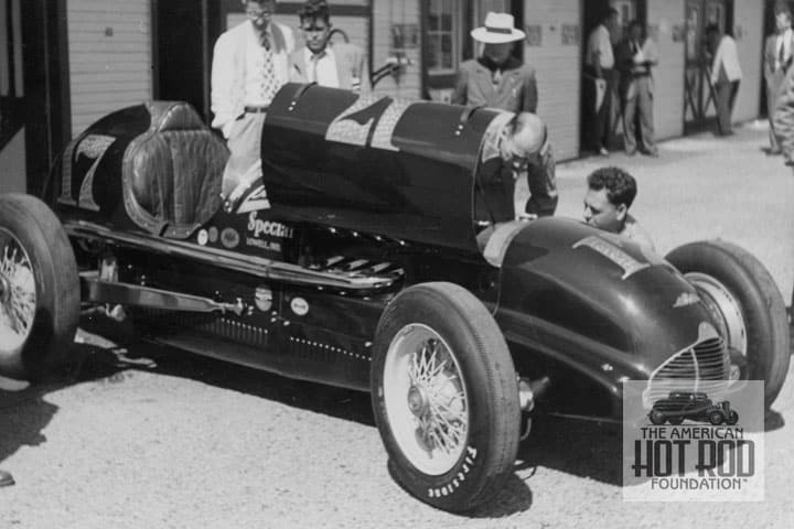 Duane Carter was the driver of this Bellanger Special for the 1949 Indy 500 (EMC_033). The blue car with gold numbers was built by the fabled Myron Stevens. A 270″ Offy let Duane qualify the car in fifth spot with a speed of 128.233 mph as compared to pole sitter Duke Nalon’s in a Novi at 123.939 mph. Mr. Carter made it through the 182nd lap before he spun in the North-East corner to end his day in 14th place. Tony Bettenhausen drove the car in the ’48 race wearing number 6 and the reshaped nose you see here to finished 14th. Bettenhausen also drove it in the ’47 race as number 29 and finished 18th