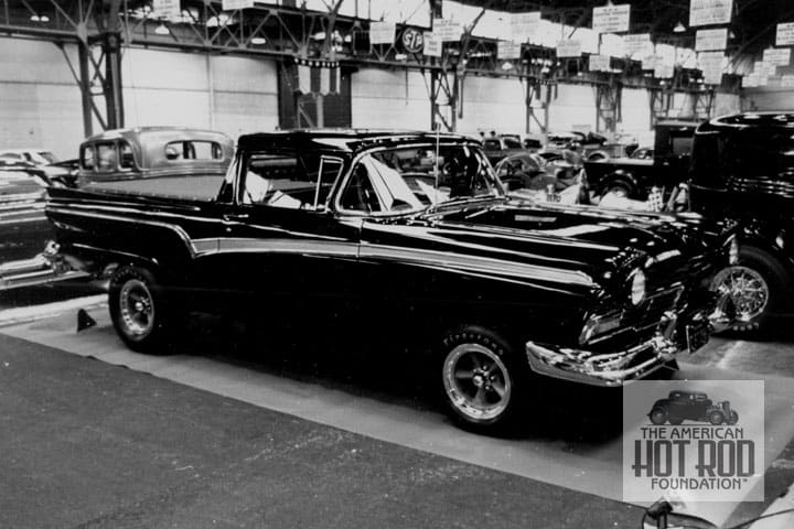 This week Steve Moal called to say Merry Christmas. We usually end up bench racing forever and got into a conversation about his old ‘57 Ranchero that we just happened to have a picture of that we got from Bonneville racer Gary Hartsock (GHC_235). So, welcome to the 1966 Grand National Roadster Show and a pix of his all-black beauty. It features ‘57 Ford Country Sedan Station Wagon side trim and Mag wheels. Under the hood was a 312″ power plant that fed a 4-speed. Pushing the envelope as he does, this one featured a 1/4 elliptic sprung rear end held in place by 7′ traction bars. Wonder how long his back tires lasted doing burnouts? The interior was black with a white headliner. Too bad it’s long gone.