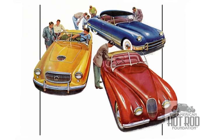 Next up in our eclectic mix this week is an illustration from the cover of the September 1951 issue of Popular Science showing two new American hot rod sports cars and a Brit (JMC_5186). In the upper right is the Muntz Jet, a Frank Kurtis creation modified by Earl “Mad Man” Muntz for production. Powered by a 336″ Lincoln V8, it was said to be good for 110 mph. On the left is the Nash-Healey. A collaboration by Nash and Donald Healey gave us this inline-6 Ambassador powered 125 mph ride. The red car was the competition, a Jaguar XK 120. With a DOHC inline 6, it was good for 125 mph. The Jag was the only one that survived and was the pick of magazine tester Wilbur Shaw on the bricks at Indy. The black lines indicate the edges of the magazine cover crop. We added what’s outside the lines.