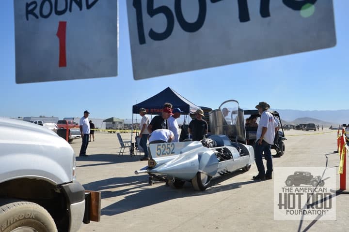 This week we received our S.C.T.A. Racing news that covered the November 8-9 races held at El Mirage. Results are usually posted on the net but we like to have hard copies of the results. The news also goes into our archives for future reference. That said, our next shot shows Logan Davis, left of the canopy, who is the owner-builder of this Class XF Blown Fuel Streamliner (JMC_5295). He’s seen talking to Dennis Mariani in his blue “3” Club Bonneville hat while waiting in pre-stage. Sidewinder member Tom Evans, on the right in the cowboy hat, un-mothballed his supercharged flattie and lent it to Logan for the meet. Tom was invited to shoe the car that was running Super Fours colors and that he did. Tom put in a lap at 190.715 mph on the 238.937 record of Costella-Yacoucci-Pappas-Stevens set back in July 2010. Not bad for a first-time effort together.