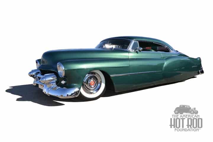 While on voluptuous bodies get a load of our next shot captures at the Mooneyes Christmas Party at Irwindale Speedway (JMC_5368). It’s time for us to put on our thinking caps to figure out this beauty. At first glance, you say oh, it a Cadillac Model 62 from 1950 before undergoing the torch. As you look a little closer you begin to backtrack a little. Cad’s didn’t have radiused front wheel wells like this one does. Then you look at the roof, Cad’s and Buick’s and Olds’ use this roof so you’re back to square one. The crease along the fender says Cad but Chevy’s had it also in ’53. The headlights come from a ’56 Olds to complicate matters more. A look at the front bumper says ’53 Cad also. The real kicker though is the rear fenders. Note how the side bulges go into the doors. Those sweeping lines were used on ’49 Cad’s, ’49 through ’54 Chevy’, ’48 through ’50 Olds’ ’49 through ’54 Pontiacs. Confused yet? We’re guessing this great ride was originally a ’53 Cad. Photographed on 12-13-14, like the car these numbers won’t happen again in this century, and we’re not talking Buick.