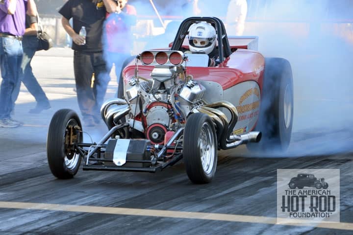 Besides oozing customs and hot rods in the parking lot, Irwindale has a 1/8 mile Drag Strip and that’s where we snapped Edger Reyes putting some heat in his tires executing a burnout in his Bantam bodied digger. Could we say smokin hot?
