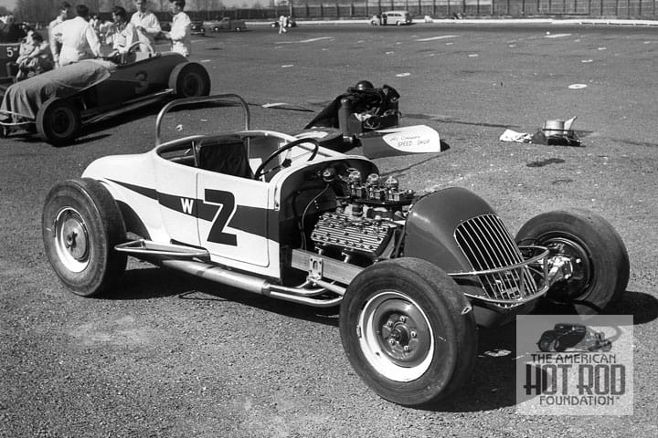 While researching the photos above we ran across another shot in our archives that we never got around to captioning, so it was time (RBC_044). All you have to do to find out more on Bob Dunker’s ’27 bodied track roadster is dig out a copy of the July 1951 issue of Hot Rod Magazine. If you don’t have one never fear. That’s a souped-up ’48 Mercury flat motor running Weiand heads, Offenhauser intake, and Winfield cam. Bob built the car at home as a hobby and went on to become ’48 high-points man in the Roadster Racing Association Washington State. The pic was taken by Tom Medley and used as a reference by illustrator Rex Burnette while doing one of his famous cutaways for the magazine.