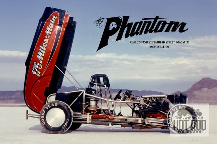 More phone calls ensued this week in the form of gabfests with Ron Main. Partner George Poteet had decided he wants to do some more racing after totaling their racer at Bonneville this year so Ron is up to his usual and starting to ram-rod the project. Building a new car for the salt in 8-months is going to be a bear but the team will get-er-done. They will be using existing body molds to create a look-alike body covering a new chassis-running gear. Cool. We dug out a shot of Ron’s first Bonneville effort in the guise of The Phantom (RON_011). Ron is an expert at shaking up everyone who he comes in contact with and that included the S.C.T.A. He took the beloved flathead and engaged “Dandy” Dick Landy to soup one up for him. That he did with exhaust ports on the top of the block. C. Everett had owned the XF/STR record since ’71 at a speed of 135.287 mph until Ron came along in 1990 and bumped it to 151.493 mph. This hero card from ‘90 gives us a look at the car under its skin.
