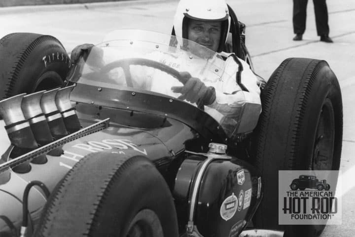 Last up for today is young Sprint Car shoe Don Davis. He was tapped to do do the driving for Bob Philips’ J. H. “Eb” Rose Truck Line Special at Indy for the ’62 500. We see him in the car on pit row during practice. Don qualified in 12th starting spot and brought the car home in fourth. The black and rose colored number 27 car was built in ’59 by Lujie Lesovsky and qualified on the pole that year driven by Johnny Thompson. Rocky Philipp was the crew chief for the car’s 4-year runs at the speedway. John Posey (no relation to Sam) took the shot.
