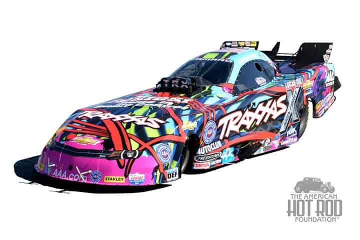 Let’s continue with one of the wildest looking slot-cars running in the Funny Car Class at the Winternationals (JMC_5414). It’s the Ford with Chevy stickers on it that was driven by Courtney Force. For power, it used a John Force Racing (JFR) 500’er and was sponsored by Traxxas Radio Control Cars. At the end of Round One qualifying our gal was solidly in ninth spot with a speed of 302.75 mph in 4.132 seconds. In round two she cut a slower lap at 293.35 mph in 4.097 seconds to stay in ninth. In Round Three, she zoomed iii into first spot with a speed of 322.65 mph in 3.995 seconds. In Round One of Eliminations, she faced off with Gary Densham and lead all the way after Gary smoked the tires. In Round Two of Eliminations, she faced off with Del Worsham. After beating him off the line by .001 seconds she lost traction and motored home at 87.42 mph in 7.289 seconds. She headed for the trailer and parked it.