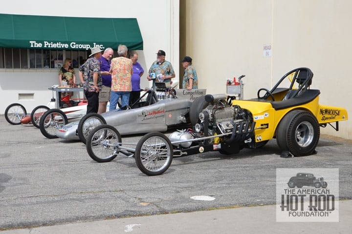 Our next shot shows a few of the “Cacklers” that showed up at the 2015 edition of Prieto’s party (JMC_5455). Our pal Jack Gillett has gotten the old Jack Chrisman driven Joe Mallard Sidewinder (center) back together and running for the event. Jack time for some Ray-Ban’s. Note that this shot shows the engine sporting only one Winfield carb.