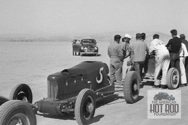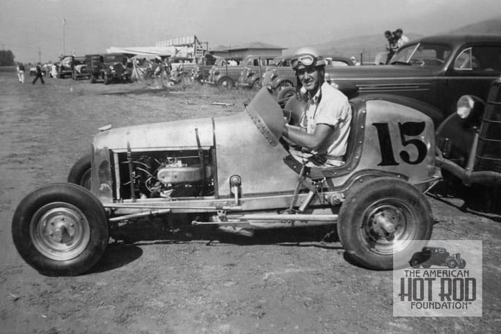 You never know what you’ll find under the hood of an S.C.T.A. ride at El Mirage or Bonneville (JMC_5485). This is a GMC 6-banger with a monster Turbocharger setup that was driven by Nathan Stewart. Entered as Skip Pipes Racing running the number 374 in Class F Blown Fuel Roadster, s his cool shot showing Einar “Swede” Lindskog early in his career at Oakland Speedway back around ‘36 or ’37 according to the plate on the rodded Chevy on right. Born on Saint Patty’s day in 1917, Swede built his first racer in his high school shop class and went racing. He honed his skills considerably before going off to war with the Air Corps. He hooked up with Jim Travers while fighting “Japs” on Iwo Jima and they built a midget racer on the island with “borrowed” parts in their spare time. After the hostilities, it was back to racing. The Swede made it to June 27, 1946, before crashing to his death before 18,500 spectators at Gilmore Stadium.