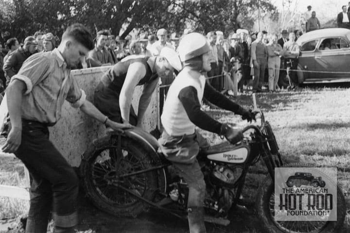 Our next bike shot is also a mystery (HAI_049). On the left, we find Gus Hunter with his hand on the rear fender of a Harley Davidson hill climb rig. Note the board behind the bike used for staging and protecting spectators from clods of dirt. Also not the chain on the rear well to add some traction. The rider is identified as Snooky Owens. The only thing we could find on Mr.Snooky” is that he rode a Crocker Speedway bike in the early ’30s. Needless to say, we’ve got a lot of work cut out for us on identifying the players in Mr. Haigler’s 50 plus shots.