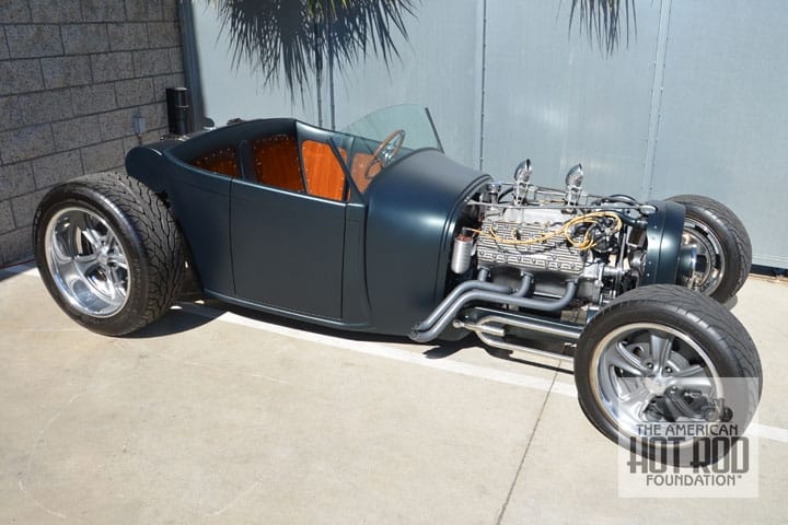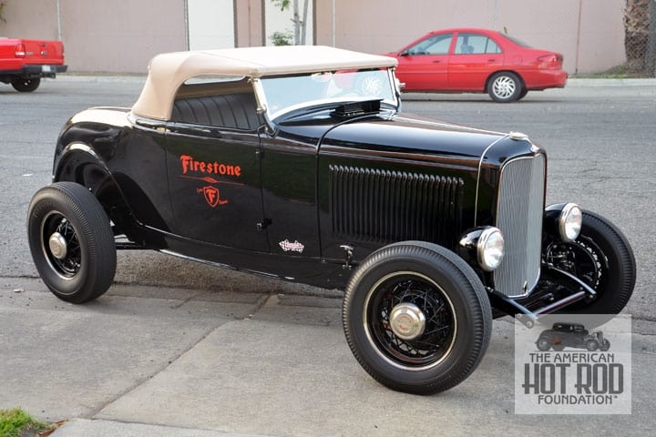 Out front on the street, we spied this fantastic-looking Deuce Roadster sporting a Firestone logo on each door (JMC_5477). Wow! And check out those hubcaps that read “Firestone Air Balloon Wheel”.