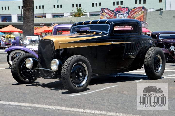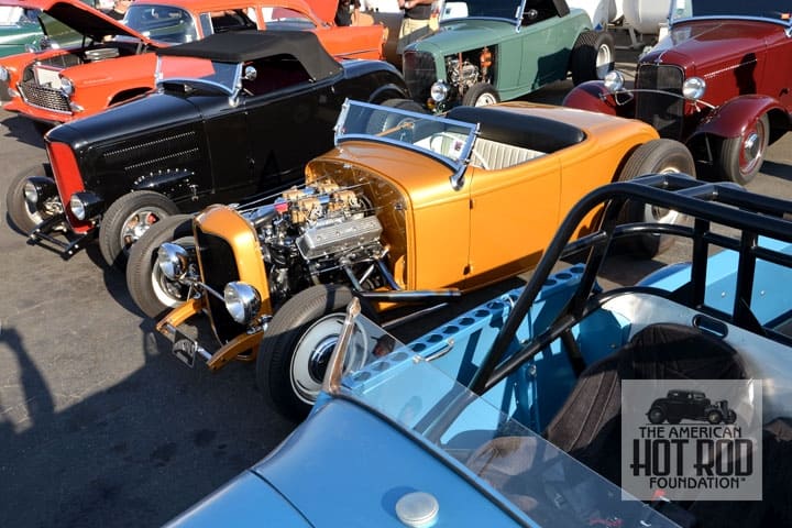 Behind So-Cal’s shop at the open house was this lineup of great rides (JMC_5472). Everywhere you look these days the old Roadster Pickup can be seen. Note how far the Deuce’s windshield is laid back, we call it swoopy.