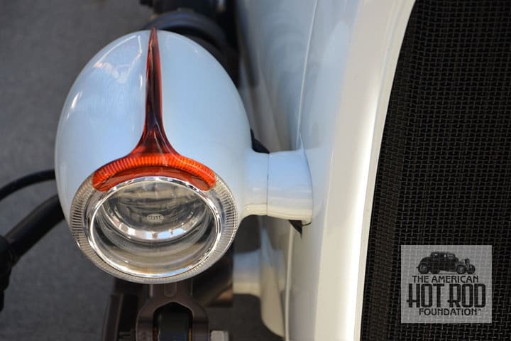 Another car that said different was this 3-window Deuce Coupe spotted at Bobby’s and photographed at the Fair (JMC_5480). What grabs you is how understated it is. Take the low-slung Rolling Bones style headlights for instance. And the gold scallops, they grab your attention the way they run up into the roof but don’t overpower the side of the car. We also like the little teardrop at the end of the side stripe. Cool.