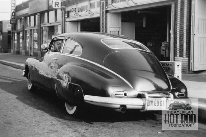 Here’s one of those photos that were pasted inside the Newhouse Handbook (JMC_5527). You’re looking at the rump of a ’46 to ’48 Buick Super of the fastback kink. Those with sharp eyes will notice the side trim has been removed as well as the decklid chrome. Even Harley Earl’s reflectors have been removed from the rear fenders to give the car a sleek, sleek look. It’s interesting that the door handles and lock have survived. The super-peeper folks will notice the notched rear bumper to clear those after-market dual pipes. We’re guessing the shot was taken in ’48 as the plate has the ‘48 and later bolt-on tag. The other two inside cover shots show one plate that also had a ‘48 tag.
