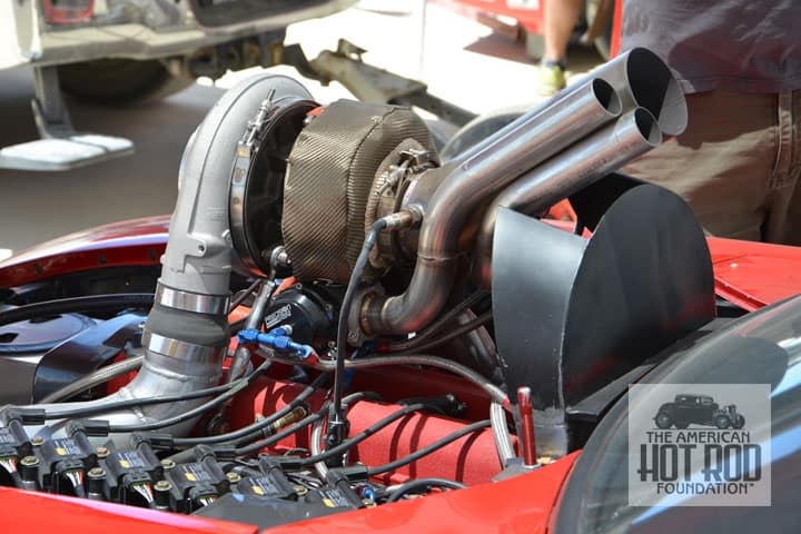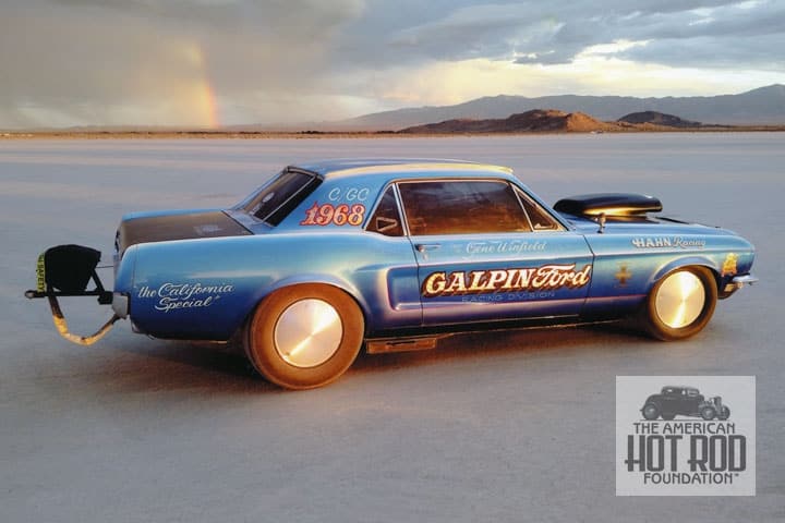 Here’s a great shot of Jim Hahn’s California Special taken at El Mirage during the June 14th (last month) races. This is one rare Stang as Ford only produced 3867 of the GT/CS’s in the model year 1968. Jim drove it through the lights at a speed of 179.597 mph on a 194.271 mph Classic Gas Coupe record set way back in November of ’02. Gene Winfield did the fancy fade job and Dennis Jones applied the Galpin signage to make one slick looking ride. Gene is slated to drive it if he’s ever inded in ‘52). Willie ended up the week with a one way run of 252.20 mph and a 244.66 mph record to become the fastest Hot Rod in the world. Behind the liner is the yellow Class C lakester wearing number 8 of the Stanford Brothers that in its past life was painted purple and driven by Bill Phy. The car ended up running 169.97 mph for a second in class.
