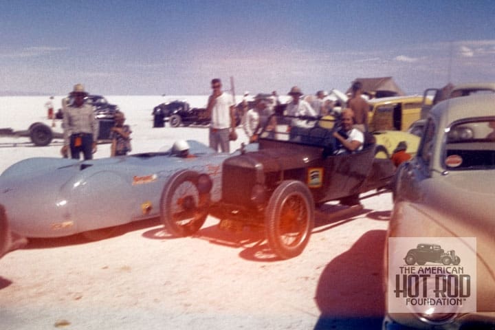 Talking about getting things straight here’s another new Mark Karolchik shot of the K&L liner taken the same year. (KCH_013). Roy “Multi” Aldrich was the official greeter at Bonneville for many years. He’s seen here in his T parked to Willie Young sitting in the Kenz & Leslie Streamliner at Bonneville in 1952 (we previously thought the shots were taken in ‘51 but that yellow ring around the front exhaust pipe (hidden in last week’s B&W shot) was at a 172.515 mph record that’s been the book since October ’94. We predict that he will grab the record at the next lakes meet.