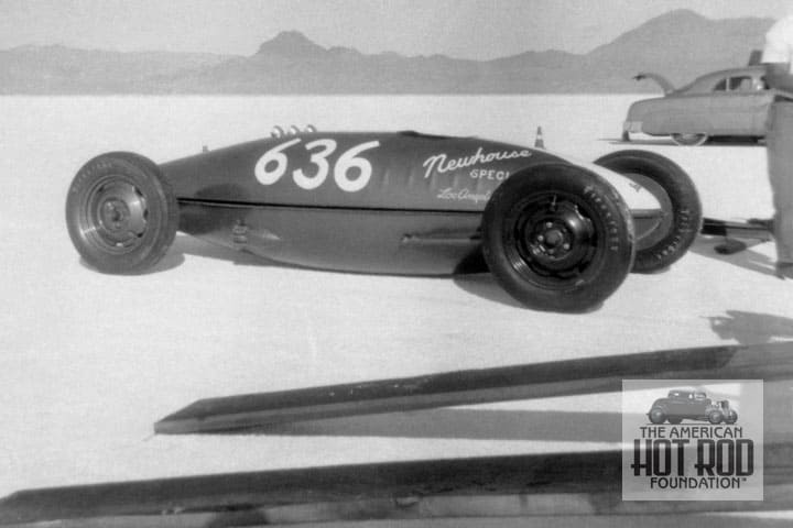 Newhouse Automotive sponsored the bellytank seen at Bonneville in our first picture today (MBB_161). This ’52 shot shows the car wearing the numbered 636 and had a graphic painted on the nose and a Sta-Lube decal added. The program said it was powered by a 296″ 1942 Ford and was to run in Class C Lakester. So far, so good. A look at the results didn’t show the car having recorded a speed. Can we assume that it had engine trouble and didn’t make it through the timing devices? That the fun and the frustration of having a few but not all the pieces. In ’51 the Newhouse team had shown up with basically the same car (we have pictures of it). It ran as car number 36 (they had just added a 6 in front of it for ‘52) and was powered by a 296″ Merc Flattie. Top speed was 163.339 mph for a sixth in Class C.